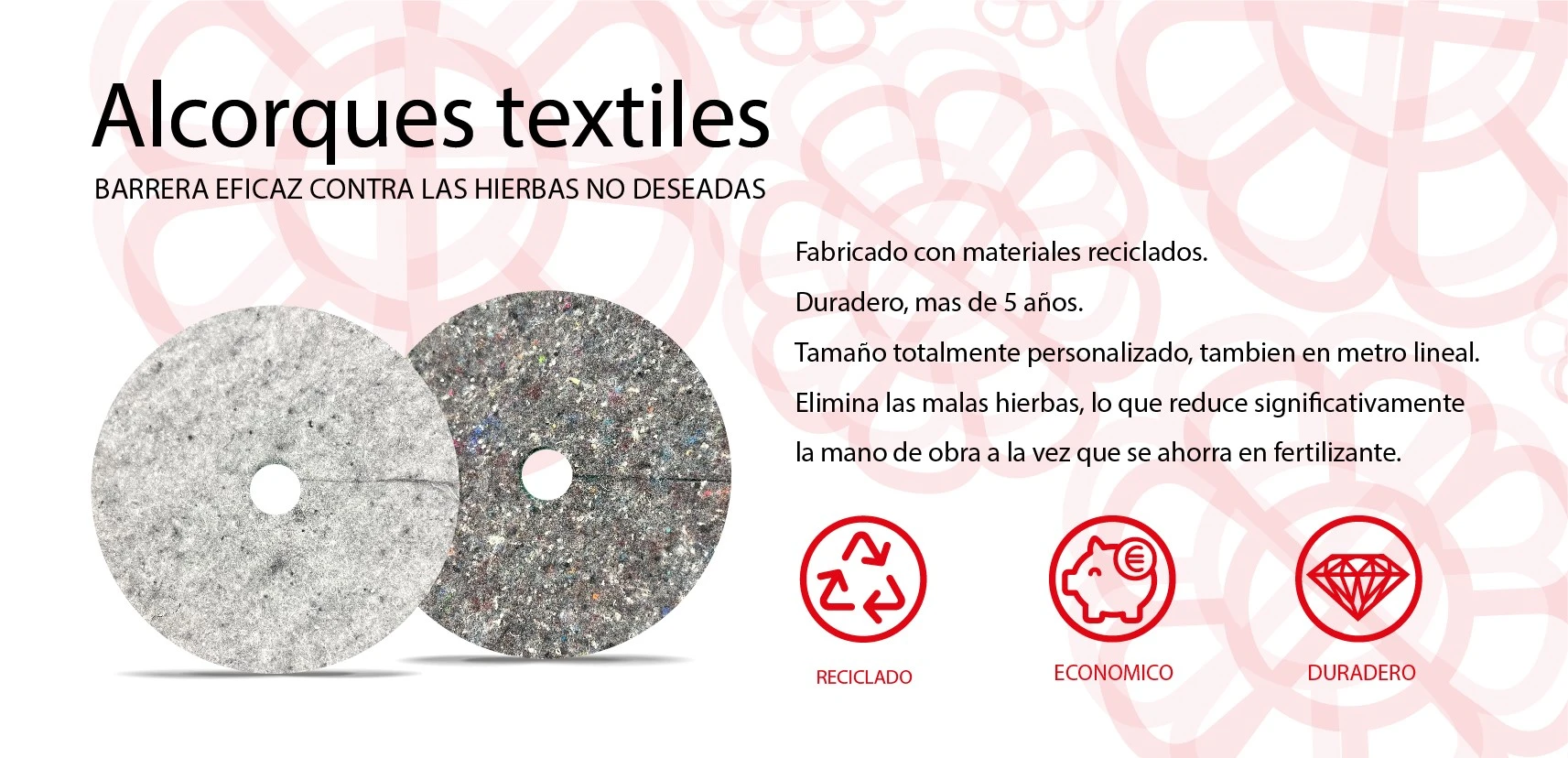 Ofrecemos una solución eficaz y duradera para el control de malezas en grandes macetas y árboles en las aceras. Proporcionamos alcorques cortados a medida para adaptarse perfectamente a cada espacio. Nuestros alcorques textiles están diseñados para facilitar el mantenimiento de zonas urbanas, reduciendo la necesidad de mano de obra al evitar el crecimiento de malas hierbas y optimizando el uso de fertilizantes. Además, son una alternativa sostenible y respetuosa con el medio ambiente.